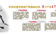 “5個(gè)嚴(yán)禁”“17”個(gè)不準(zhǔn)”和“5個(gè)一律” “5個(gè)嚴(yán)禁”:  嚴(yán)禁拉票賄選、嚴(yán)禁買官賣官、嚴(yán)禁跑官要官、嚴(yán)禁違規(guī)用人、嚴(yán)禁干擾換屆“17個(gè)不準(zhǔn)”:  1、不準(zhǔn)在民主推薦、民主測(cè)評(píng)、組織考察和選舉中搞拉票等非組織活動(dòng),通過(guò)宴請(qǐng)、安排消費(fèi)活動(dòng)、打電話、發(fā)短信、當(dāng)面拜訪、委托或者授意中間人出面說(shuō)情、舉辦聯(lián)誼活動(dòng)等形