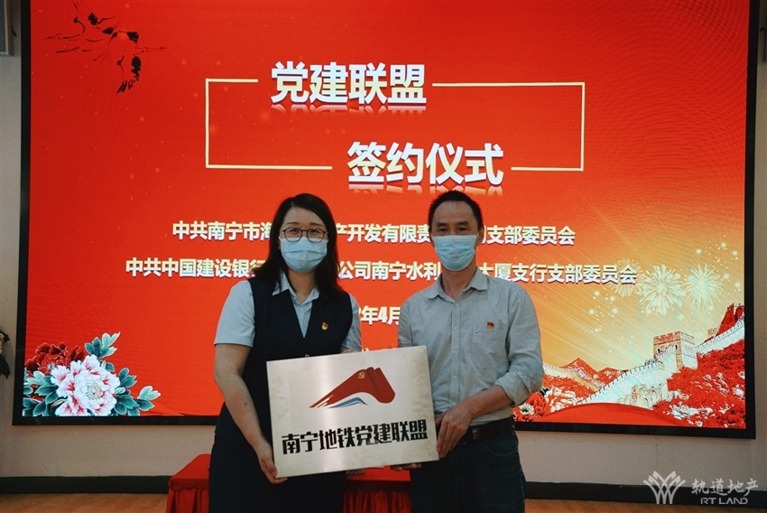 隨后,在雙方黨員的見證下兩家黨支部共同簽訂了《黨建聯(lián)盟協(xié)議書》,海茵公司黨支部向建行南寧水利電力大廈支行黨支部贈送了“南寧地鐵黨建聯(lián)盟”牌匾,并帶領對方黨員參觀了海茵·國際花城項目樓盤。