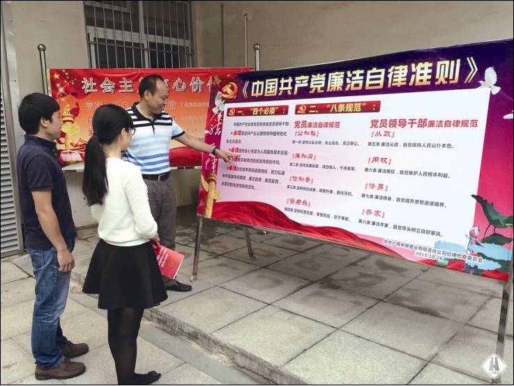 為增強(qiáng)學(xué)習(xí)貫徹的自覺性、主動(dòng)性,把學(xué)習(xí)貫徹與具體工作實(shí)際結(jié)合起來,公司紀(jì)檢監(jiān)察室在第一時(shí)間進(jìn)行宣傳貫徹。一是以短信形式,向公司全體黨員和中層以上干部發(fā)送2期《廉政知識(shí)學(xué)習(xí)卡》短信,并就“妄議中央”、“老鄉(xiāng)會(huì)、校友會(huì)、戰(zhàn)友會(huì)”、“四類人員不得買賣股票”、“社會(huì)主義核心價(jià)值觀”等內(nèi)容分4次發(fā)送短信進(jìn)行解讀,以最快捷的方式、最簡(jiǎn)潔的字句讓黨員干部及時(shí)了解和知曉《準(zhǔn)則》和《條例》的關(guān)鍵內(nèi)容;二是組織黨委中心組成員集中專題學(xué)習(xí);三是制作四版《準(zhǔn)則》和《條例》宣傳版報(bào),分別布置于二樓、三樓辦公走廊;四是為全體黨員訂購人手一份《中國共產(chǎn)黨廉潔自律準(zhǔn)則、中國共產(chǎn)黨紀(jì)律處分條例、中國共產(chǎn)黨章程》單行本,全部發(fā)放到每一位黨員手中,要求原原本本、逐字逐句認(rèn)真學(xué)習(xí);五是在公司OA信息系統(tǒng)黨務(wù)紀(jì)工團(tuán)門戶發(fā)布通知學(xué)習(xí)。