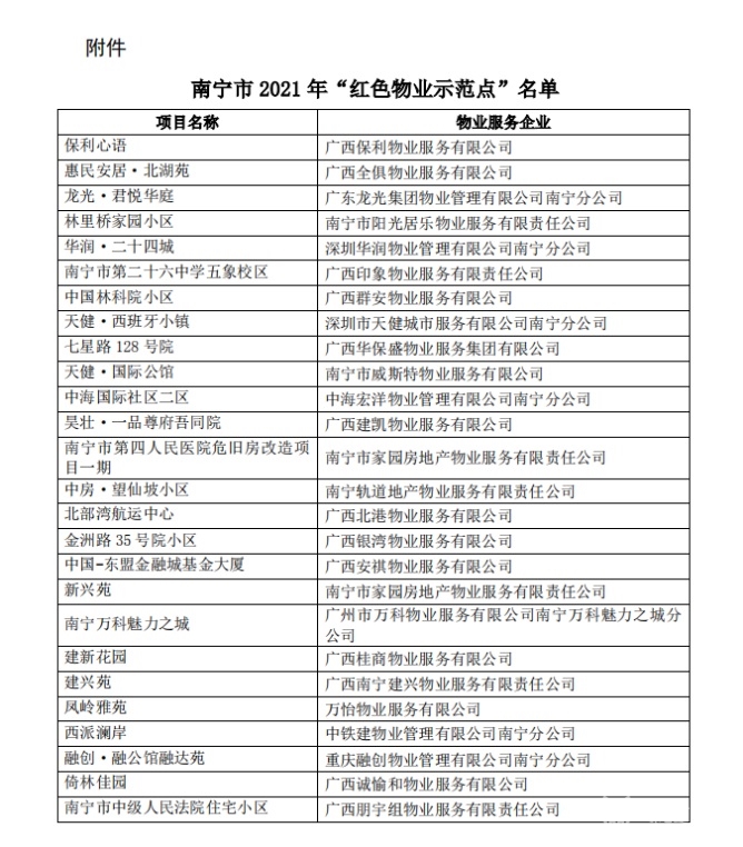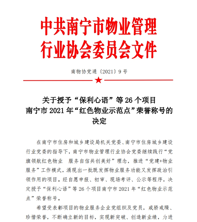 根據(jù)中共南寧市物業(yè)管理行業(yè)協(xié)會委員會、南寧市物業(yè)管理行業(yè)協(xié)會《關(guān)于授予“保利心語”等26個項目南寧市2021年“紅色物業(yè)示范點”榮譽稱號的決定》,中房·望仙坡小區(qū)喜獲“紅色物業(yè)示范點”榮譽稱號。
